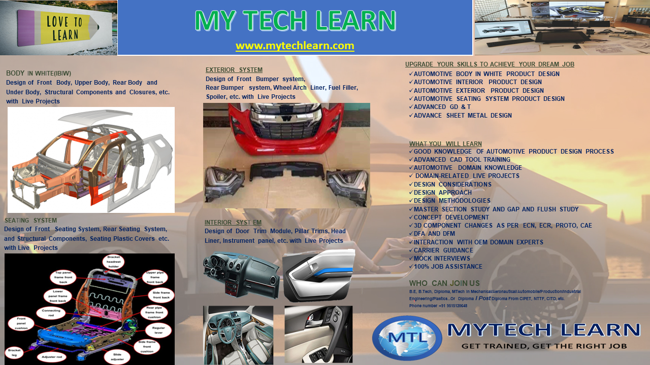 At MYTECH LEARN, we're proud to expand our range of domain expertise training programs, led by accomplished professionals in key sectors including Automotive, Aerospace, Transportation, and Heavy Engineering. In today's fast-paced world, automotive companies are actively seeking innovative solutions to streamline product development. Our commitment to delivering top-tier training encompasses a deep dive into Engineering domain knowledge, combined with practical CAD tools and techniques. These skills are not just taught but integrated seamlessly into every stage of the product life cycle. Whether you're aiming to excel in Automotive, Aerospace, Transportation, or Heavy Engineering, MTL equips you with high-quality training, ensuring you're well-prepared to contribute to the industry's rapid evolution and meet its ever-growing demands effectively.